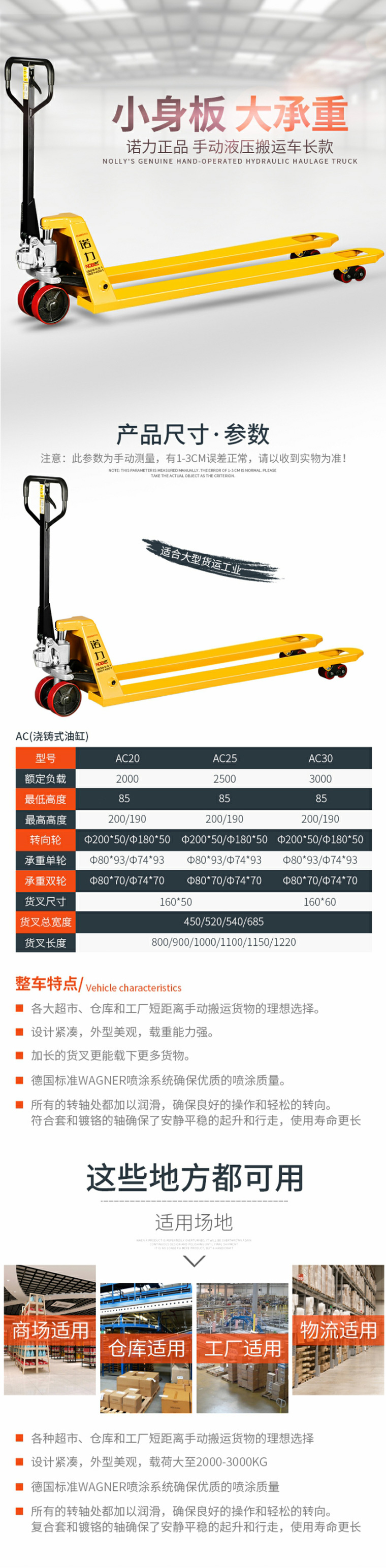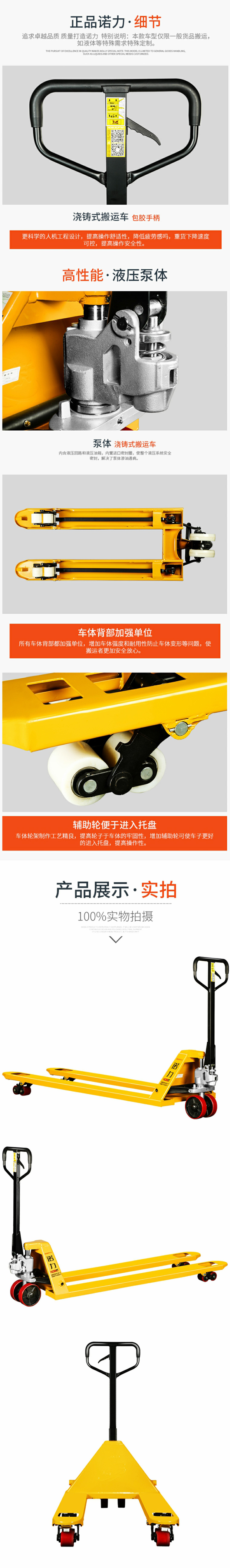 手動(dong)托盤搬運(yun)車 俗稱地(di)牛,車底盤(pán)與輪之間(jiān)有液壓裝(zhuāng)置,可以方(fang)便的将☁️車(che)推入貨箱(xiang)底座之下(xia),然後用液(yè)壓将底盤(pán)升高,托起(qǐ)貨物。搬運(yun)車手柄設(shè)計符合人(ren)體工程學(xué)原理,具有(yǒu)提升、搬運(yun)、放下三大(da)功能。