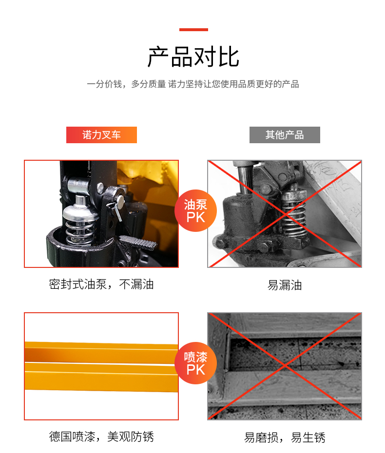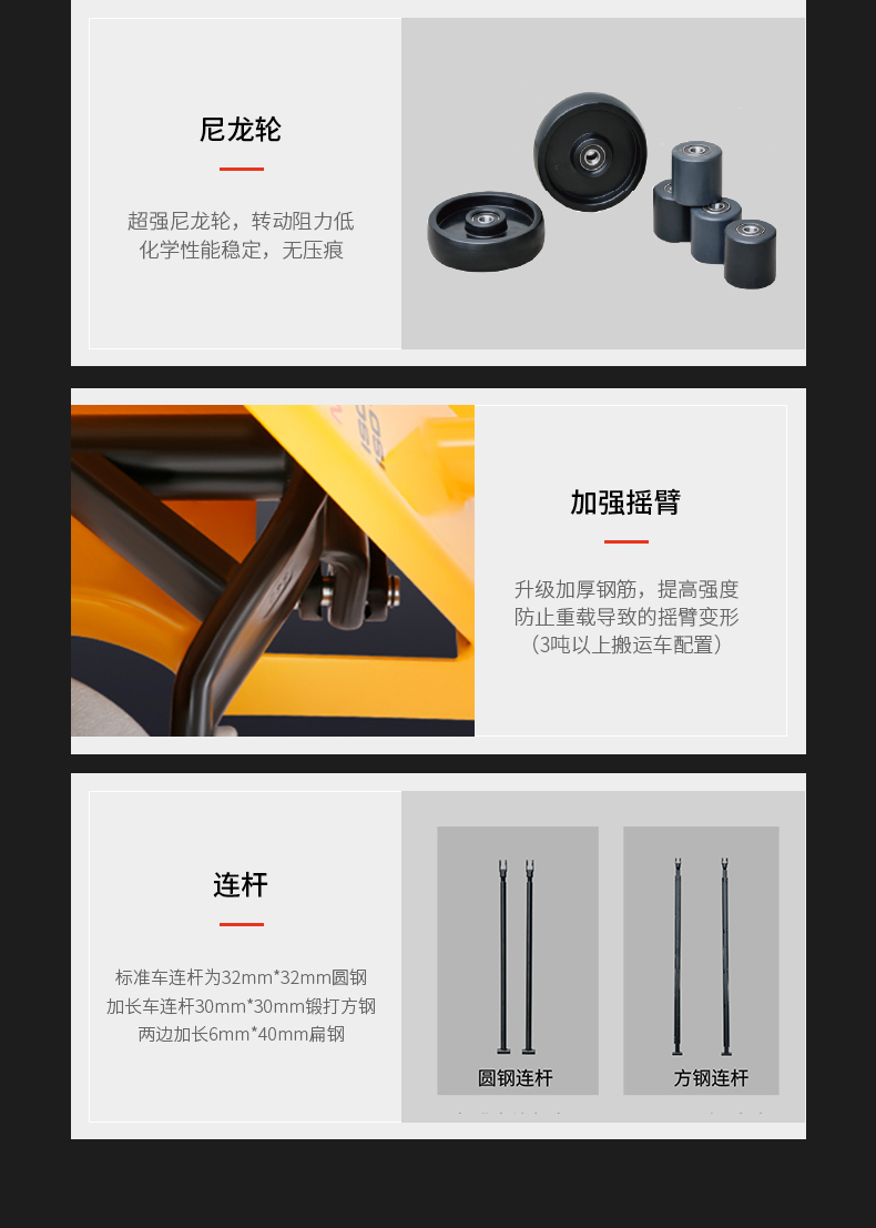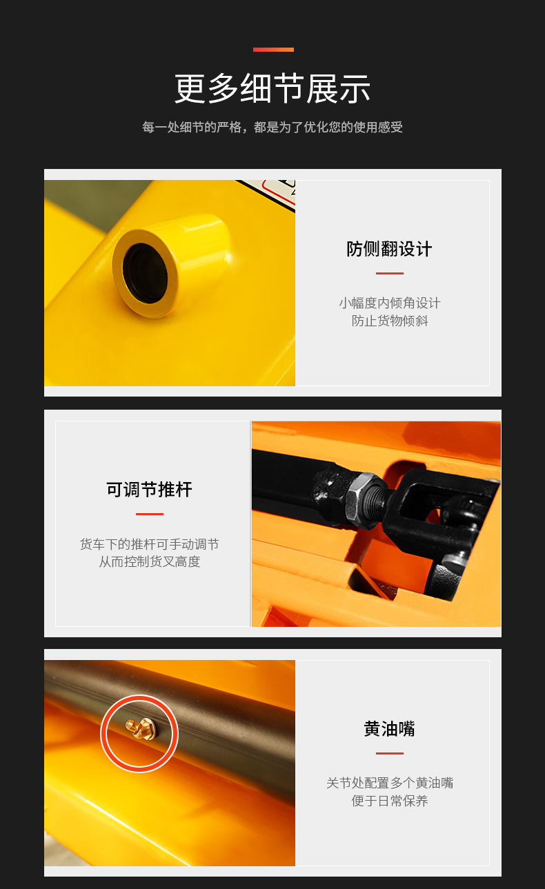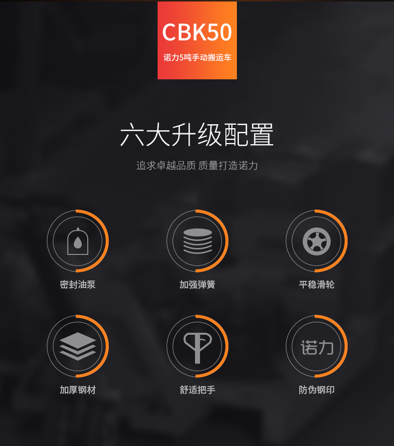 産品賣點 設計(jì)出衆,品質的搬(bān)運車 是各種超(chāo)市、倉庫🤩和工廠(chang)段距離手動搬(bān)運貨物的理想(xiǎng)選擇材料選用(yòng)加強型剛才,堅(jian)💰固耐用,外形精(jīng)緻美觀;德國标(biao)✔️準WAGNER噴塗💜系統确(que)保噴塗質量所(suǒ)有的轉向軸處(chu)都加以潤滑,确(què)保良好的操作(zuo)性和🌈輕松的轉(zhuan)向;複合套和鍍(du)鉻軸确保了安(ān)靜平穩的起升(sheng)和行走,延長使(shǐ)用壽命