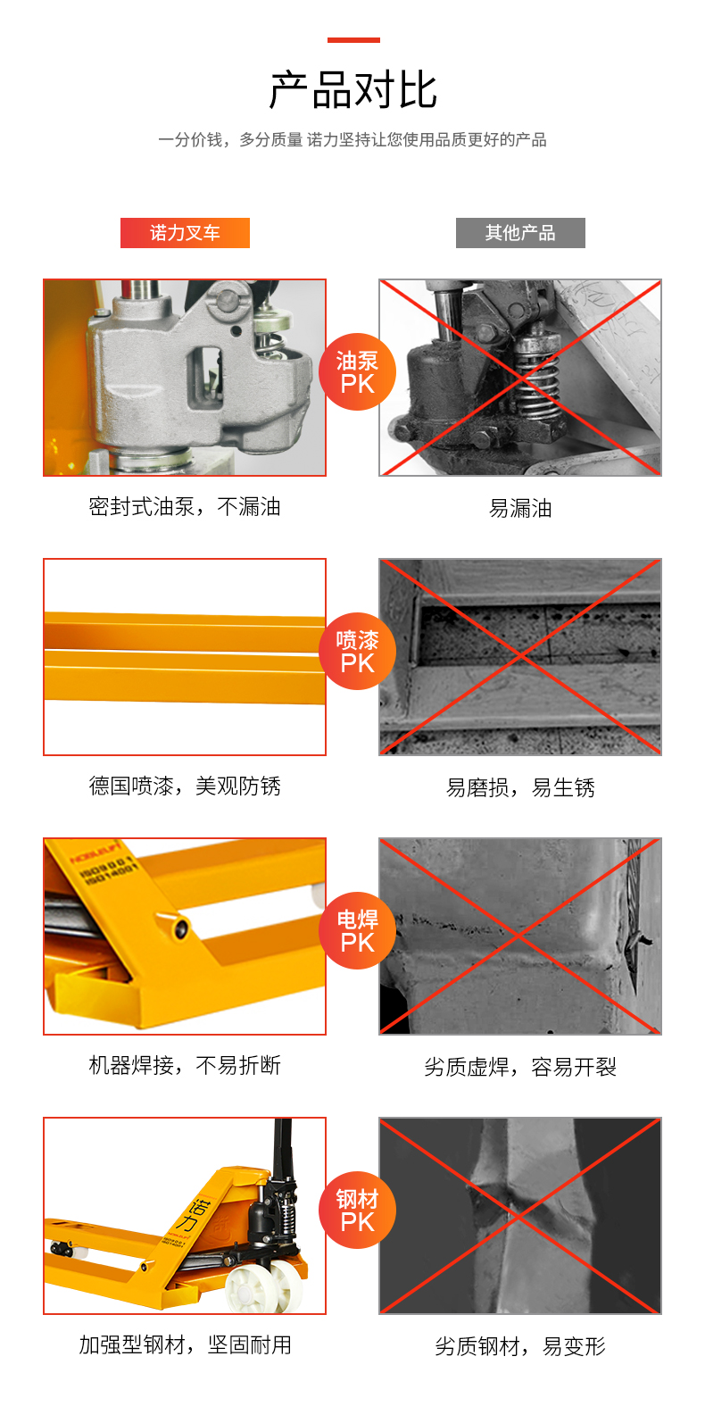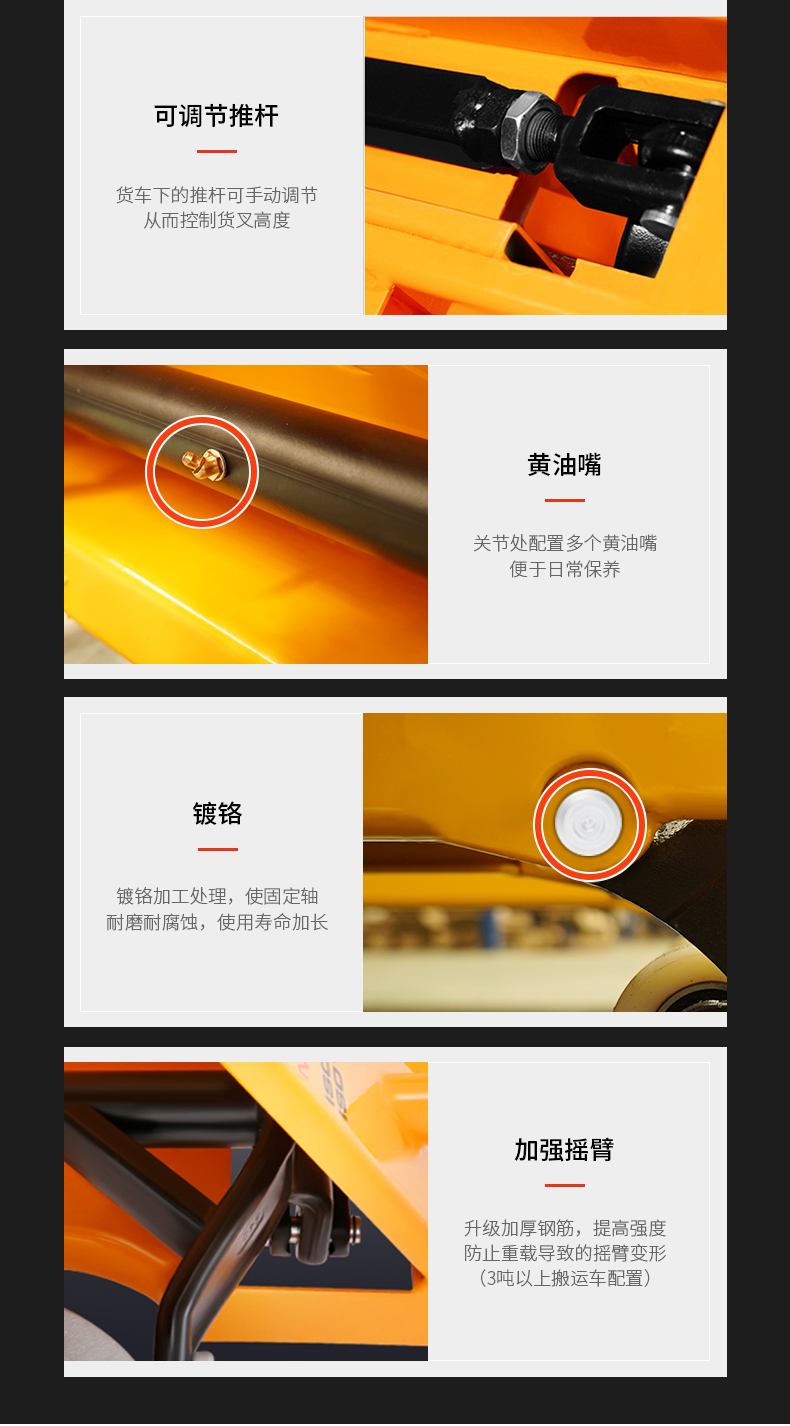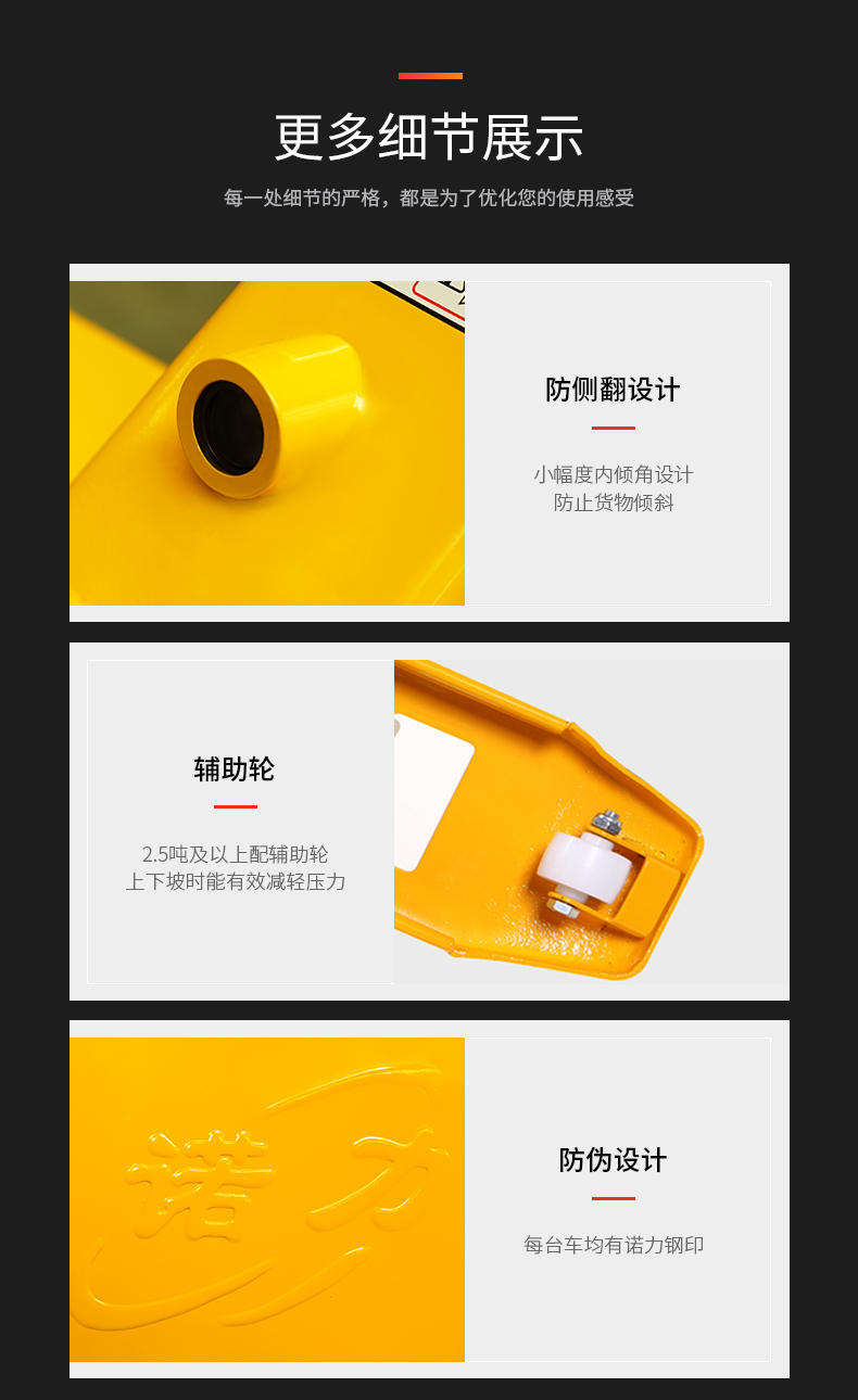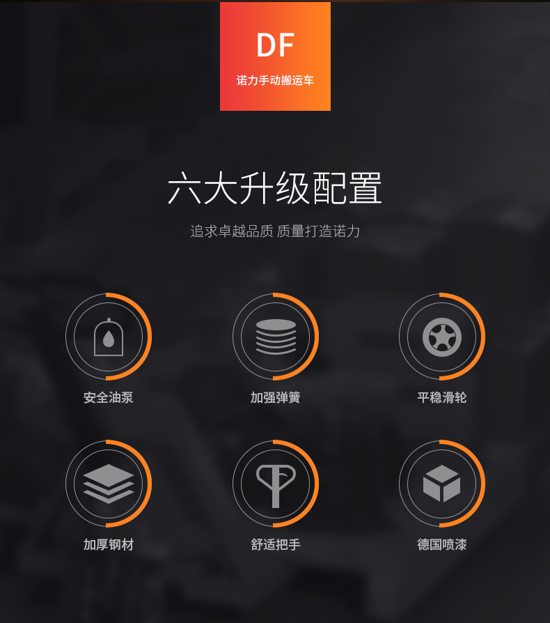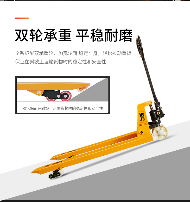産品賣點(dian) 各種超市(shì)、倉庫和工(gōng)廠段距離(li)手動搬運(yùn)貨物的理(lǐ)想選擇 設(she)計緊湊,外(wai)形美觀,大(dà)載荷2000/3000kg 德國(guó)标準WAGNER噴塗(tú)系統噴塗(tu)質量 所有(you)的轉向軸(zhou)都加以潤(run)滑,确保良(liáng)好的🔴操作(zuo)性🧑🏾🤝🧑🏼和輕松(sōng)的轉向。複(fú)合套和鍍(du)鉻的軸确(que)保了平穩(wěn)的起升和(hé)行走,使用(yong)壽命長